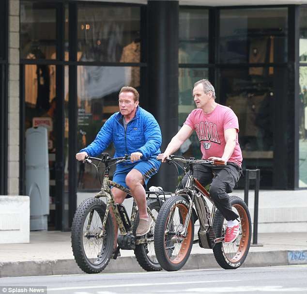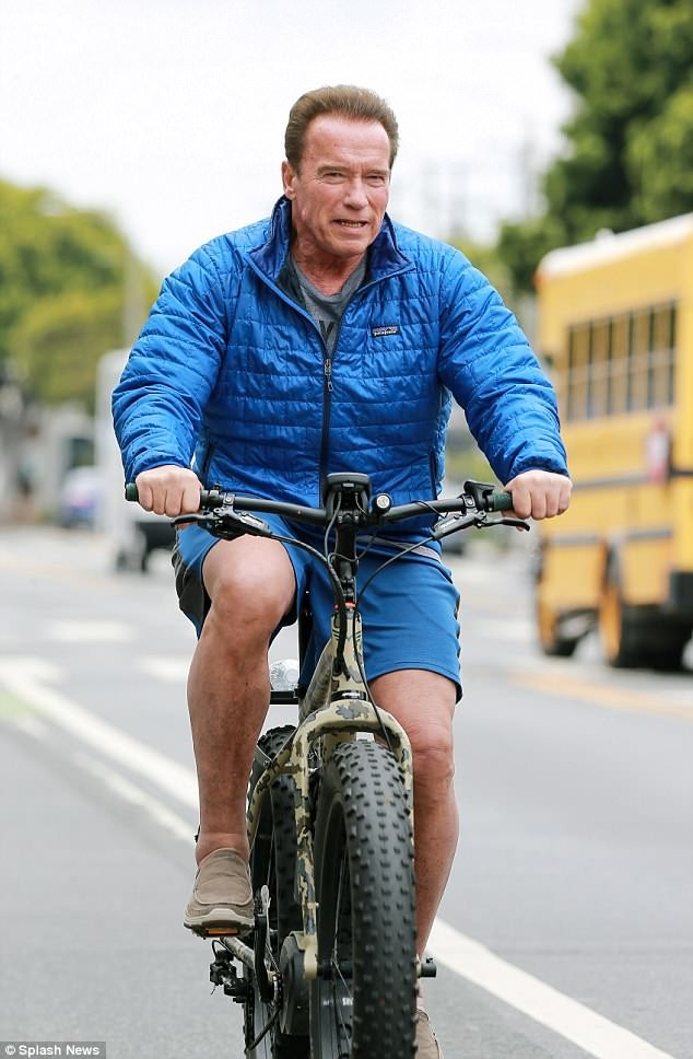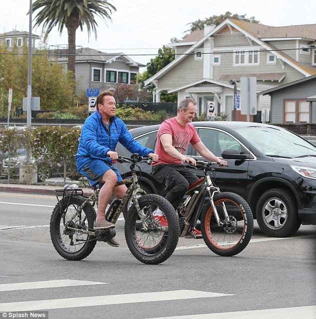 Arnold who rocked outerwear with tiny blue shorts and brown slip-on shoes smiled during the afternoon bike ride. He was also joined by a male pal.This comes less than two months after he underwent a life-saving heart surgery at Cedars-Sinai in Los Angeles, to replace his pulmonic valve. See more photos below.