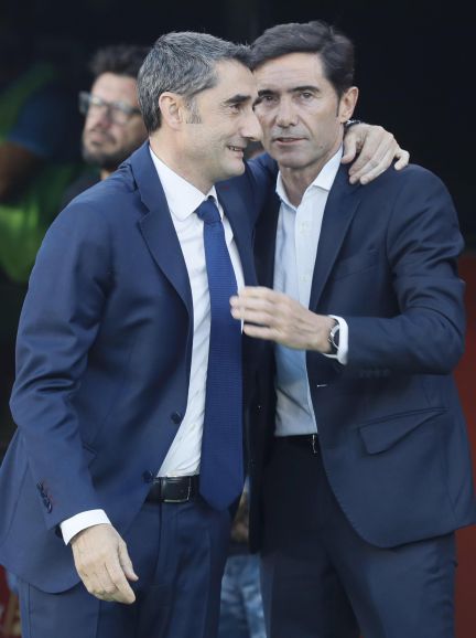 Valverde and Marcelino share a few words ahead of the game