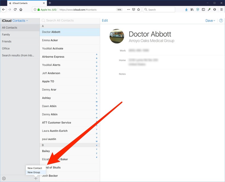 3. On the iCloud Contacts page, click the plus sign in the bottom left of the page, in the iCloud Contacts pane. In the window that pops up, click “New Group.”